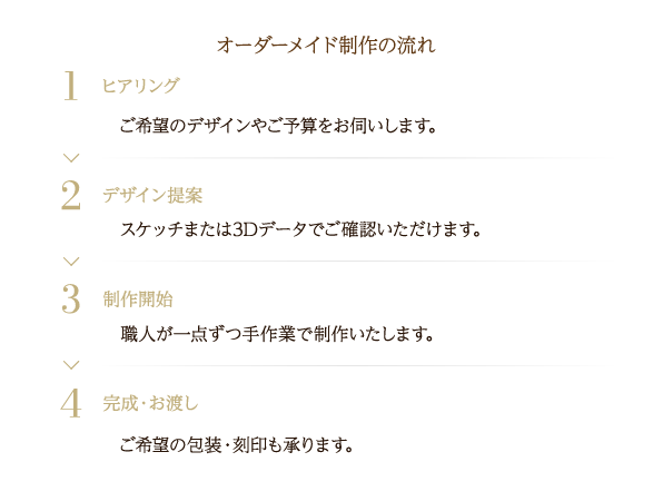 お客様の理想をデザインへ。ご予算と素材を決めるところから始まり、デザイナーが丁寧にヒアリングし、一点ものの輝きを仕立てます。